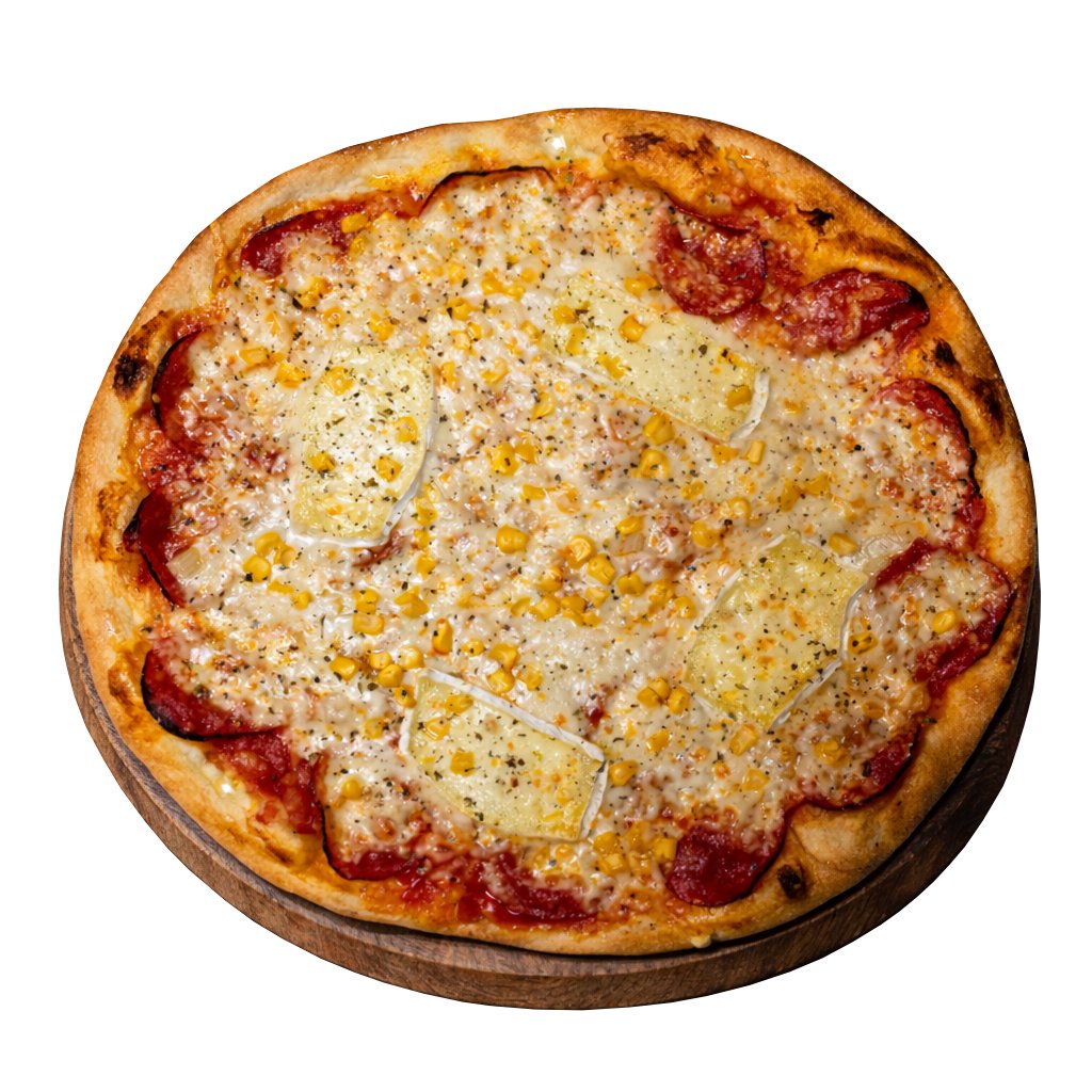 tomato, salám, cibule, kukuřice, hermelín, sýr
